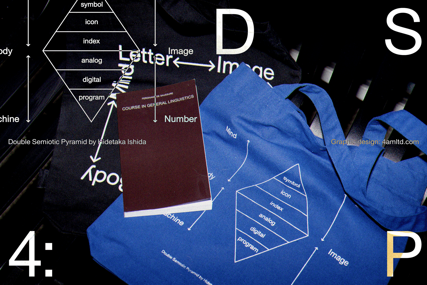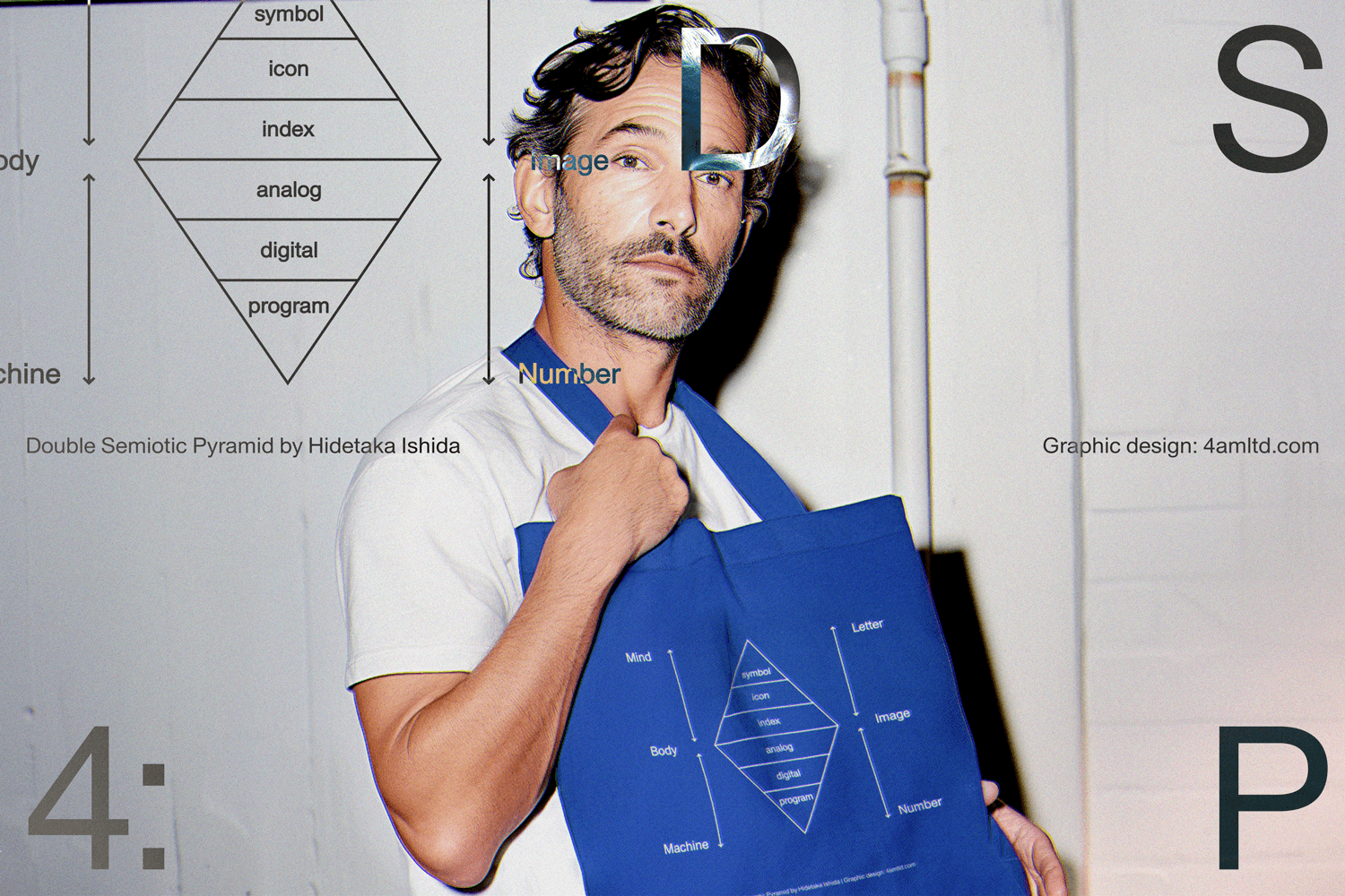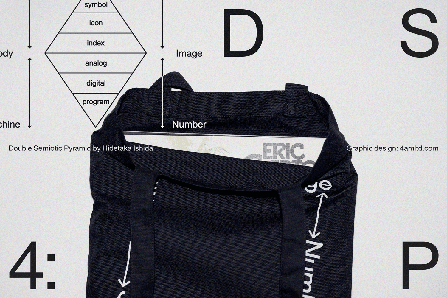 The exclusive tote bag from 4:00 AM features the “Double Semiotic Pyramid” by Hideyuki Ishida, showcasing the original illustration on one side and a typography-based graphic on the other, both in silk screen printing. Available in two colors: royal blue and black.