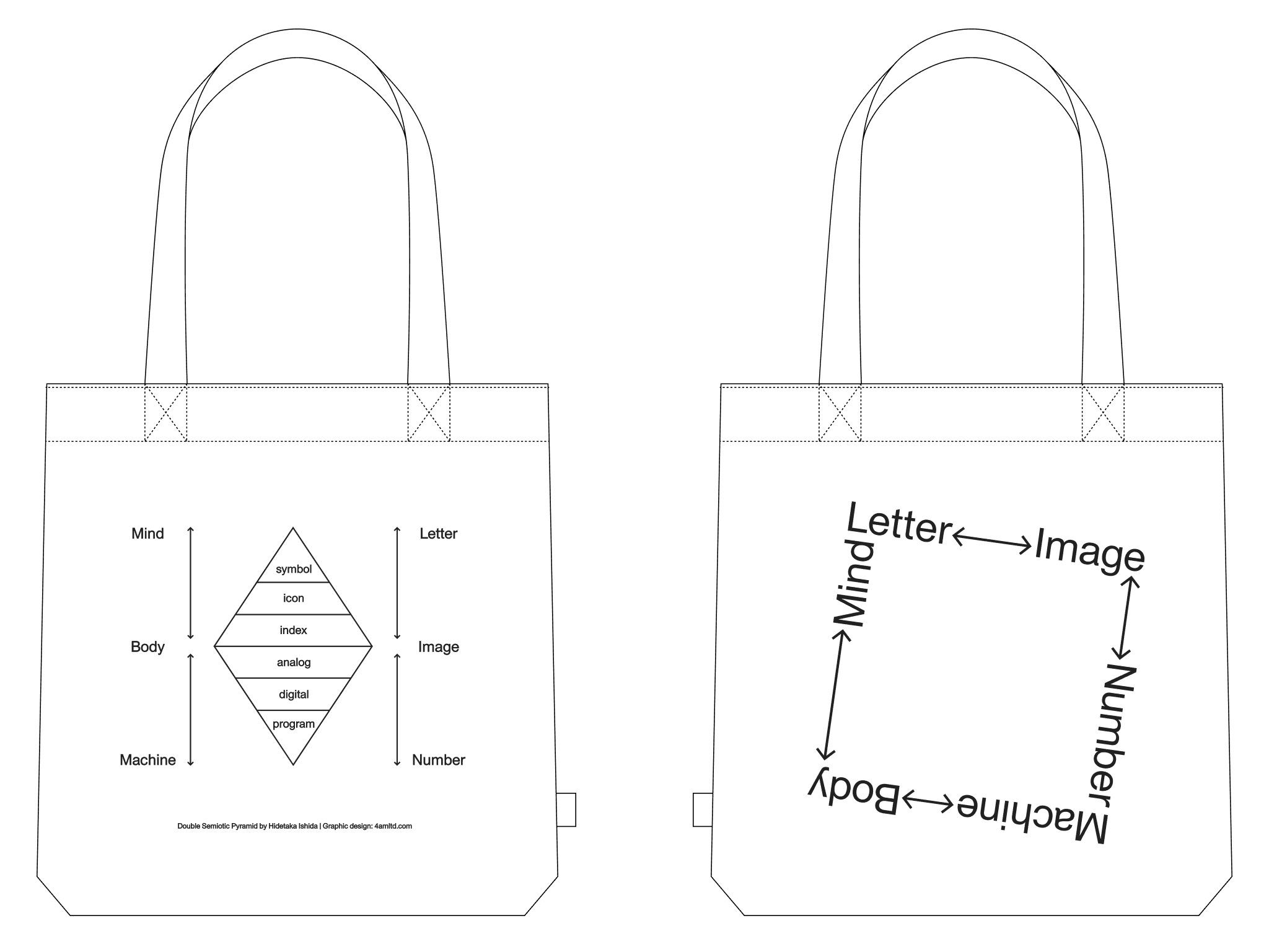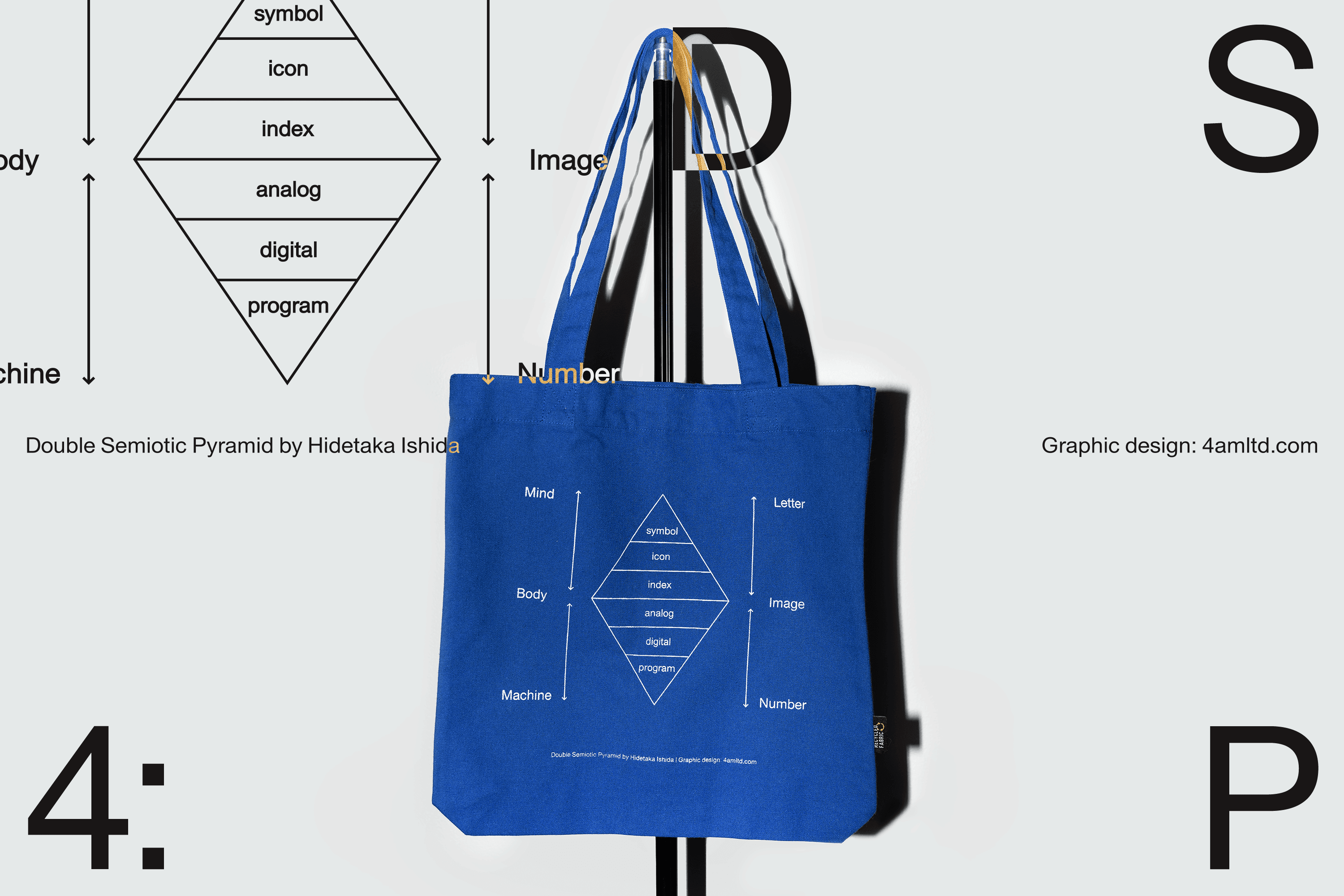 記号学者の石田英敬氏による「記号の正逆ピラミッド」をデザインした4:00 AMエクスクルーシヴのトートバッグです。オリジナルの図解に忠実なグラフィックと、タイポグラフィデザインの両面シルクスクリーンプリント。ロイヤルブルー・黒の2色展開。